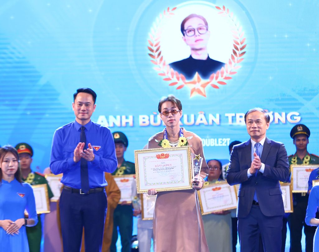 NSND Xuân Bắc, Phó Chủ tịch Hội LHTN Việt Nam và đồng chí Nguyễn Lưu Trà My, Phó Trưởng Ban Đoàn kết tập hợp thanh niên Trung ương Đoàn trao giải thưởng thanh niên sống đẹp năm 2024