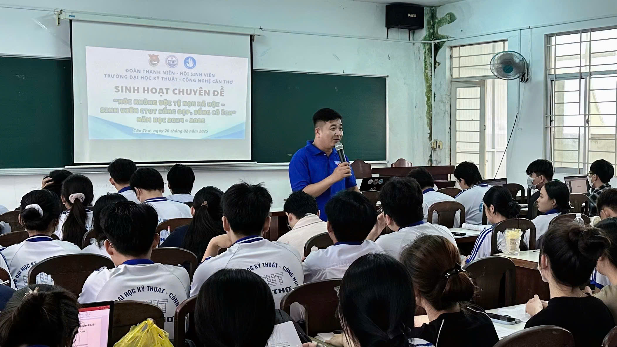 Nhằm nâng cao nhận thức, trang bị kiến thức và kỹ năng phòng, chống các tệ nạn xã hội trong sinh viên, đồng thời xây dựng môi trường học đường lành mạnh, an toàn, ngày 20/02/2025, Đoàn Thanh niên – Hội Sinh viên Trường Đại học Kỹ thuật – Công nghệ Cần Thơ đã tổ chức thành công buổi Sinh hoạt Chuyên đề với chủ đề “Nói không với tệ nạn xã hội – Sinh viên CTUT sống đẹp, sống có ích” năm học 2024-2025 tại Giảng đường C603.