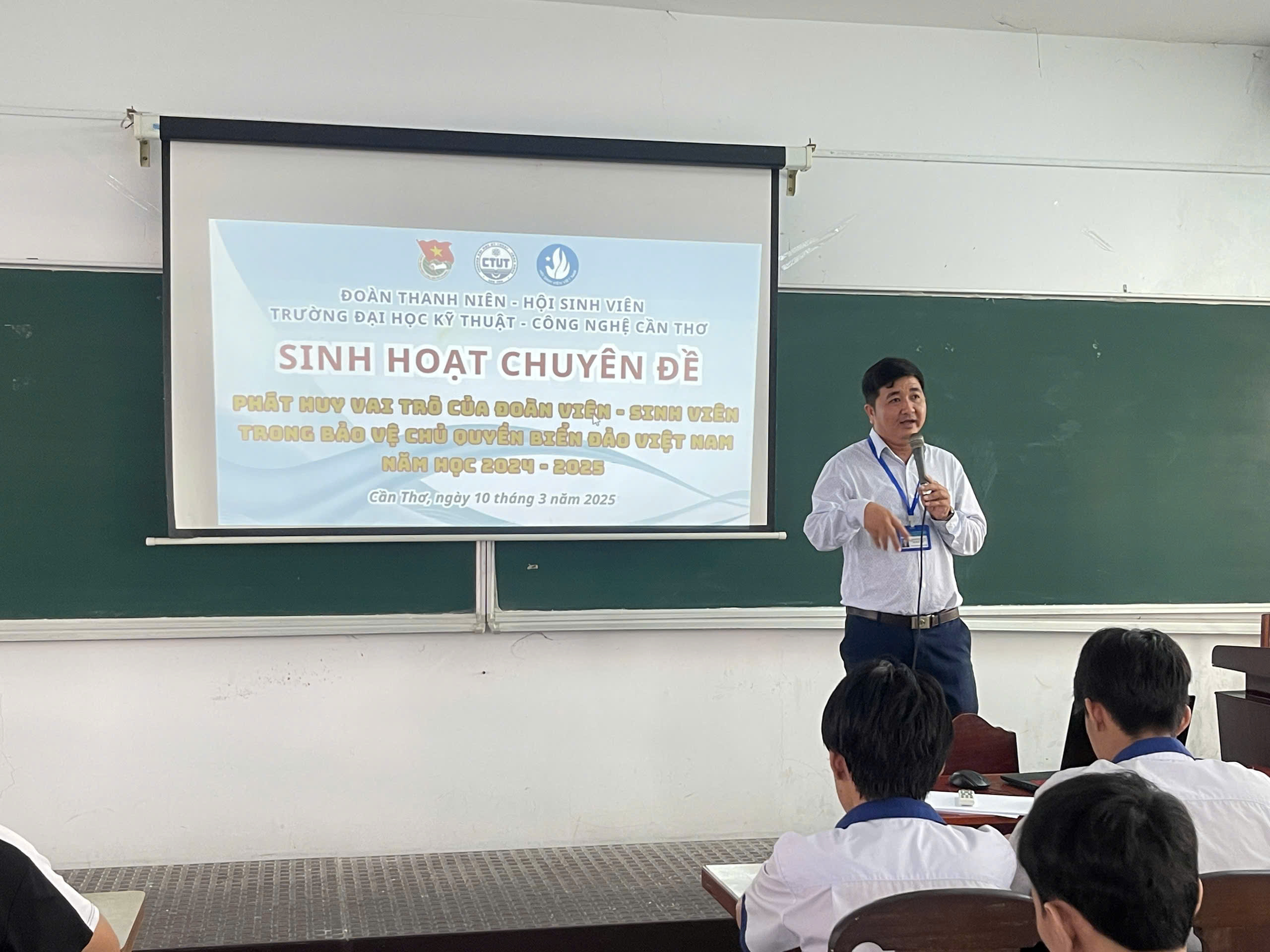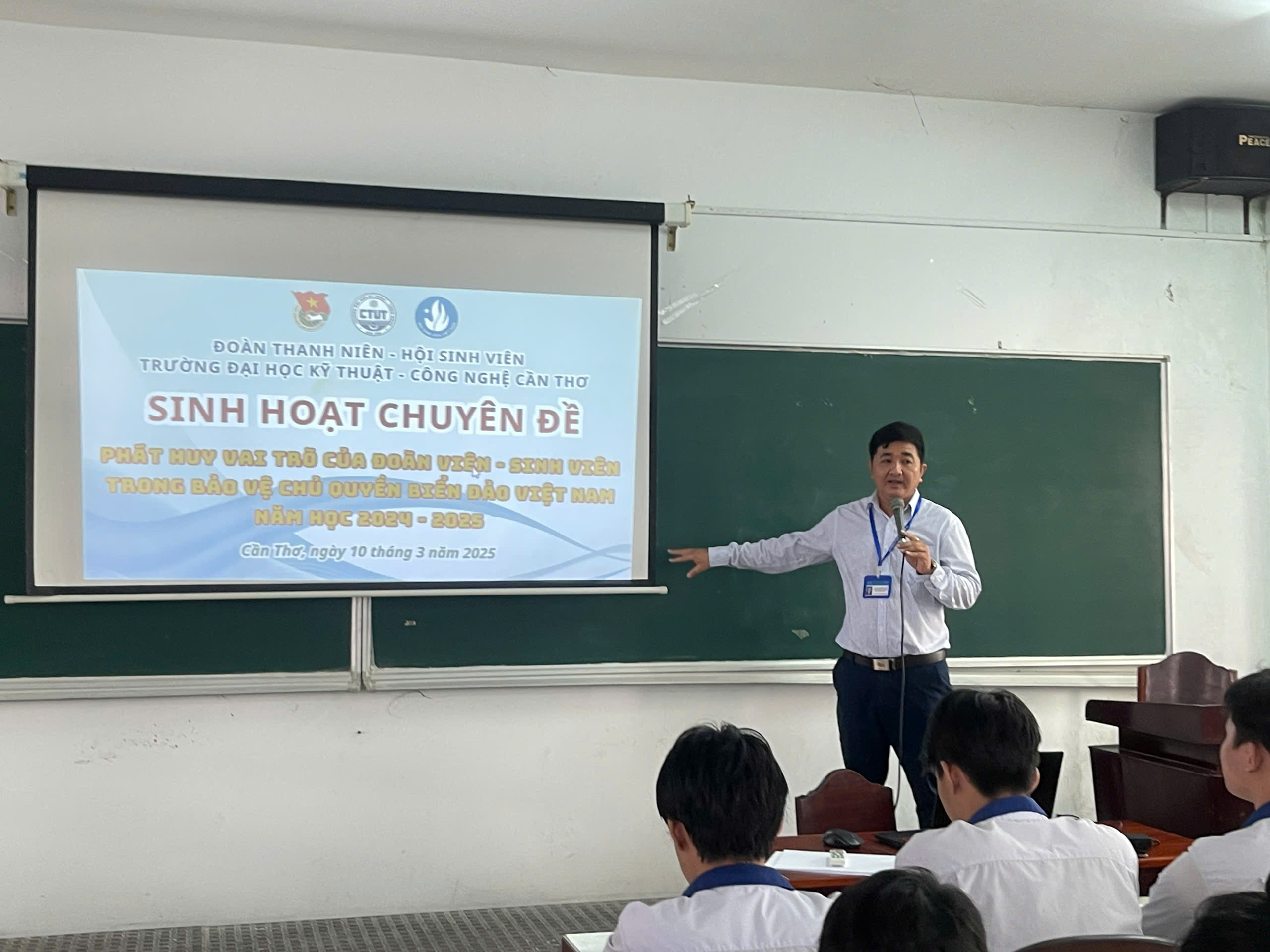 Nhằm mở đầu cho chuỗi hoạt động ý nghĩa về tuyên truyền chủ quyền biển đảo, biên giới quốc gia trong năm học 2024 – 2025, ngày 10/3/2025, Đoàn Thanh niên – Hội Sinh viên Trường Đại học Kỹ thuật – Công nghệ Cần Thơ tổ chức buổi sinh hoạt chuyên đề với chủ đề “Phát huy vai trò của đoàn viên, sinh viên trong bảo vệ chủ quyền biển đảo Việt Nam” tại Giảng đường C603, thu hút hơn 250 đoàn viên, sinh viên tham gia.
