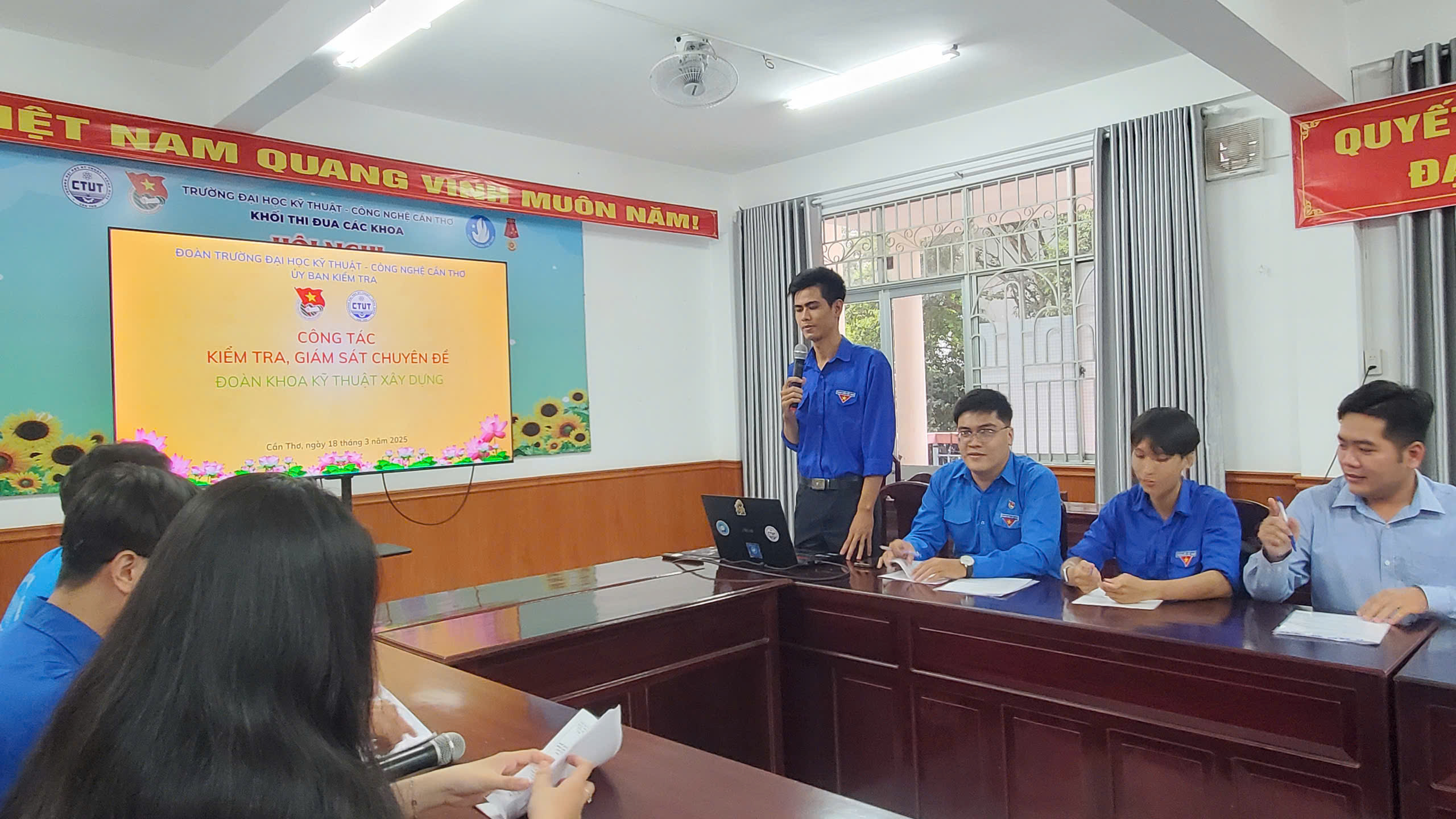 Căn cứ Chương trình làm việc của Ủy ban Kiểm tra Đoàn trường Đại học Kỹ thuật – Công nghệ khóa VI, nhiệm kỳ 2024 – 2027; Thực hiện Chương trình công tác đoàn và phong trào thanh niên năm học 2024 – 2025, Hướng dẫn số 33-HD/UBKTTĐ, ngày 20/2/2025 của Ủy ban Kiểm tra Thành đoàn Cần Thơ về công tác kiểm tra, giám sát của Đoàn năm 2025. Ngày 18/3/2025, Ủy ban Kiểm tra Đoàn Trường Đại học Kỹ thuật – Công nghệ Cần Thơ đã tiến hành kiểm tra chuyên đề đợt 1 đối với các Đoàn khoa trực thuộc trong năm học 2024 – 2025. Đây là hoạt động thường niên nhằm đánh giá công tác cán bộ đoàn các cấp, góp phần xây dựng tổ chức Đoàn vững mạnh.
