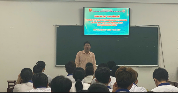 Ngày 22/4/2025, Đoàn Trường Đại học Kỹ thuật – Công nghệ Cần Thơ tổ chức Sinh hoạt chuyên đề “Thông tin tuyên truyền đối ngoại về tình hình thế giới, khu vực, quan hệ ngoại giao Việt Nam với các nước, năm học 2024 – 2025”, tại Giảng đường 506, với 50 cán bộ Đoàn, đoàn viên, thanh niên tham gia.