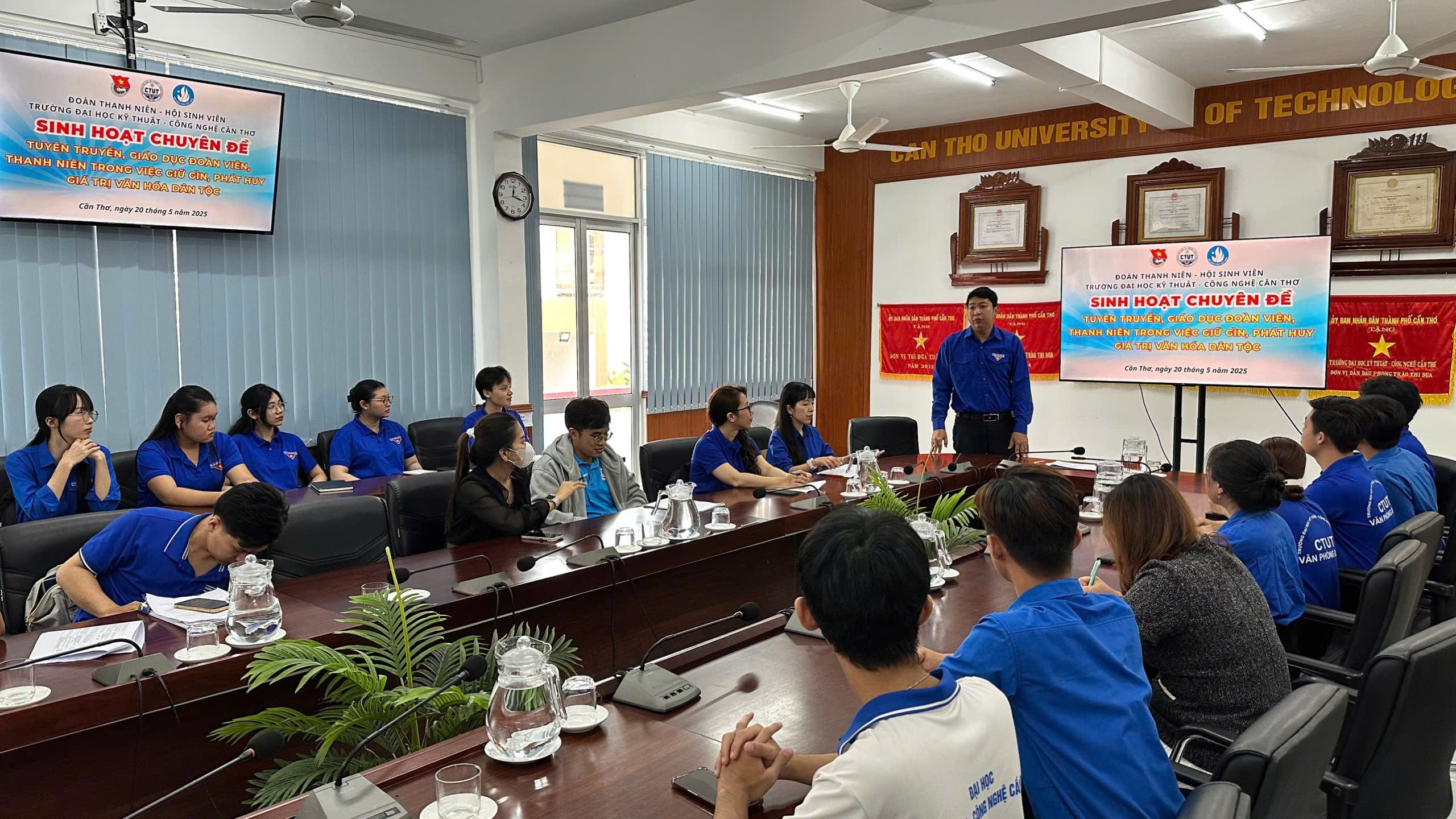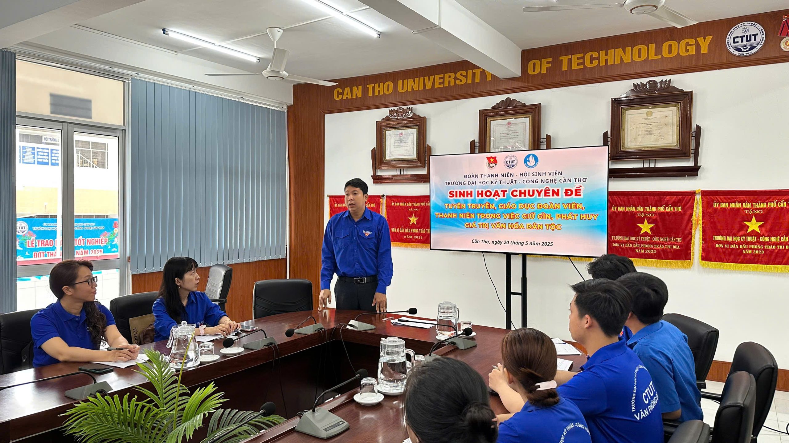Với mong muốn nâng cao ý thức và trách nhiệm của đoàn viên, thanh niên trong việc gìn giữ và phát huy giá trị văn hóa dân tộc, ngày 20/5/2025, Đoàn Thanh niên – Hội Sinh viên Trường Đại học Kỹ thuật – Công nghệ Cần Thơ đã tổ chức buổi Sinh hoạt chuyên đề “Tuyên truyền, giáo dục đoàn viên, thanh niên trong việc giữ gìn, phát huy giá trị văn hóa dân tộc” tại Phòng Hội thảo 1 CTUT.
