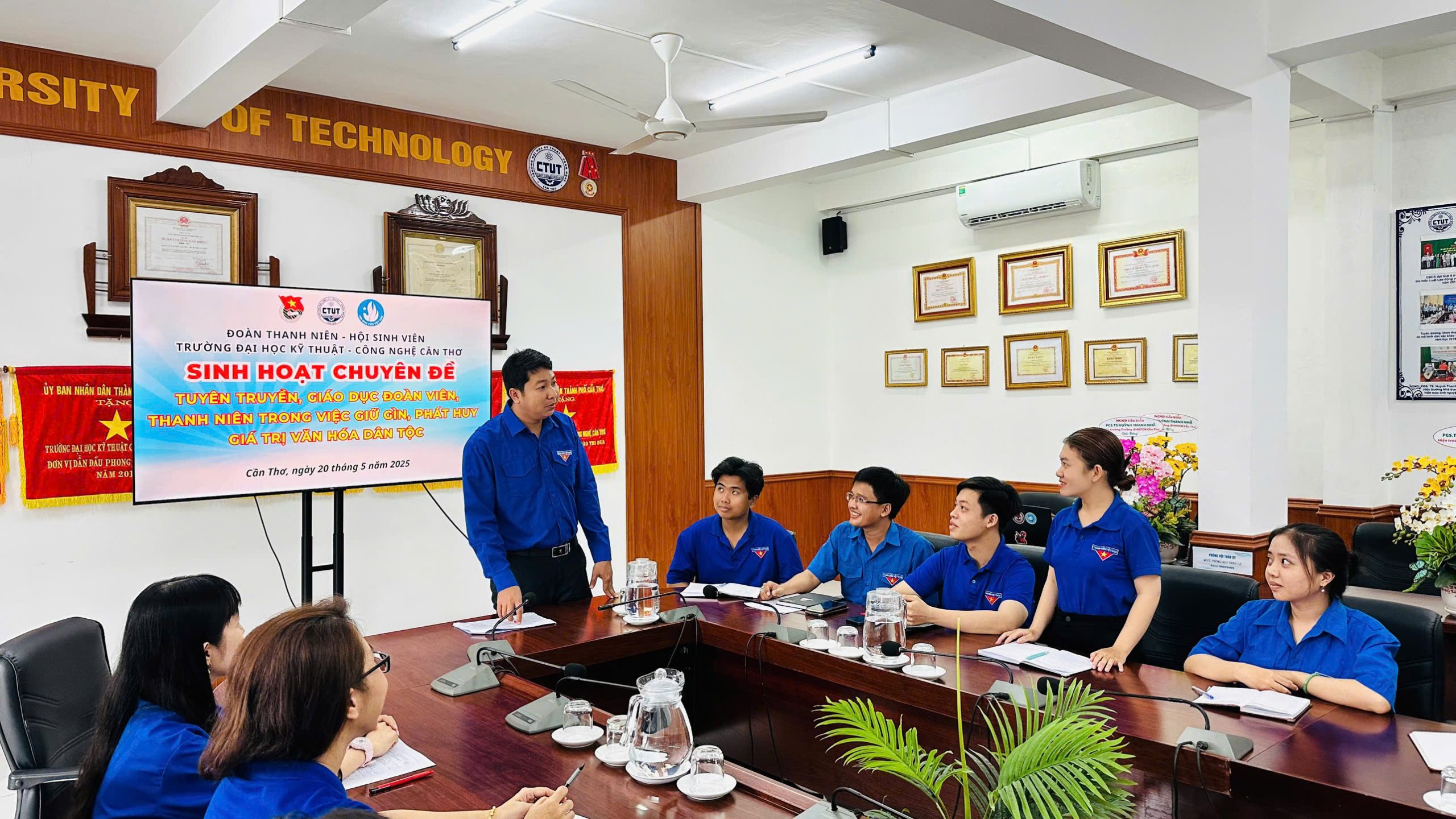 Với mong muốn nâng cao ý thức và trách nhiệm của đoàn viên, thanh niên trong việc gìn giữ và phát huy giá trị văn hóa dân tộc, ngày 20/5/2025, Đoàn Thanh niên – Hội Sinh viên Trường Đại học Kỹ thuật – Công nghệ Cần Thơ đã tổ chức buổi Sinh hoạt chuyên đề “Tuyên truyền, giáo dục đoàn viên, thanh niên trong việc giữ gìn, phát huy giá trị văn hóa dân tộc” tại Phòng Hội thảo 1 CTUT.